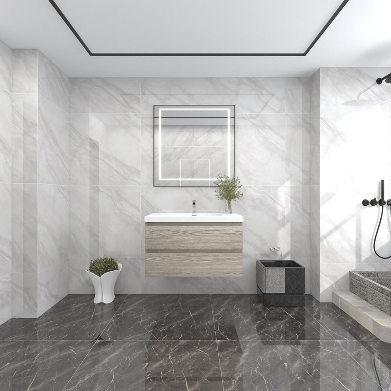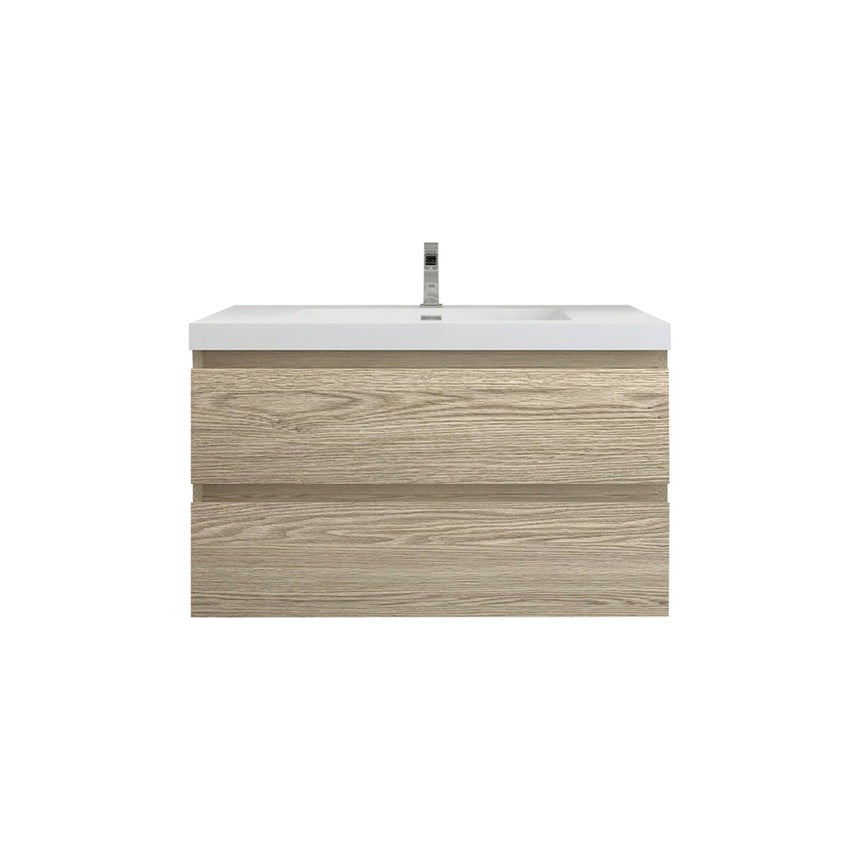 Our 36" Amber floating vanity is a perfect piece for your laundry room, powder room, or any bathroom where space may be limited. Crafted with engineered wood, it features a reinforced white acrylic top with a rectangular undermount sink and high-quality European DTC hardware that enhances the smoothness and reduces the noise of drawers. The modern wall-hung design brings a contemporary touch to the space. The overall palette is a harmonious blend of natural wood, stone textures, and sleek, modern lines, creating a serene and sophisticated atmosphere.