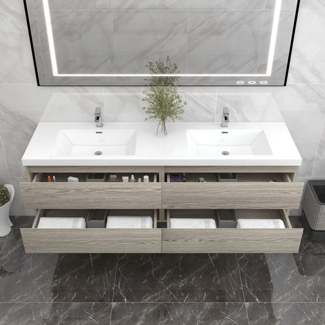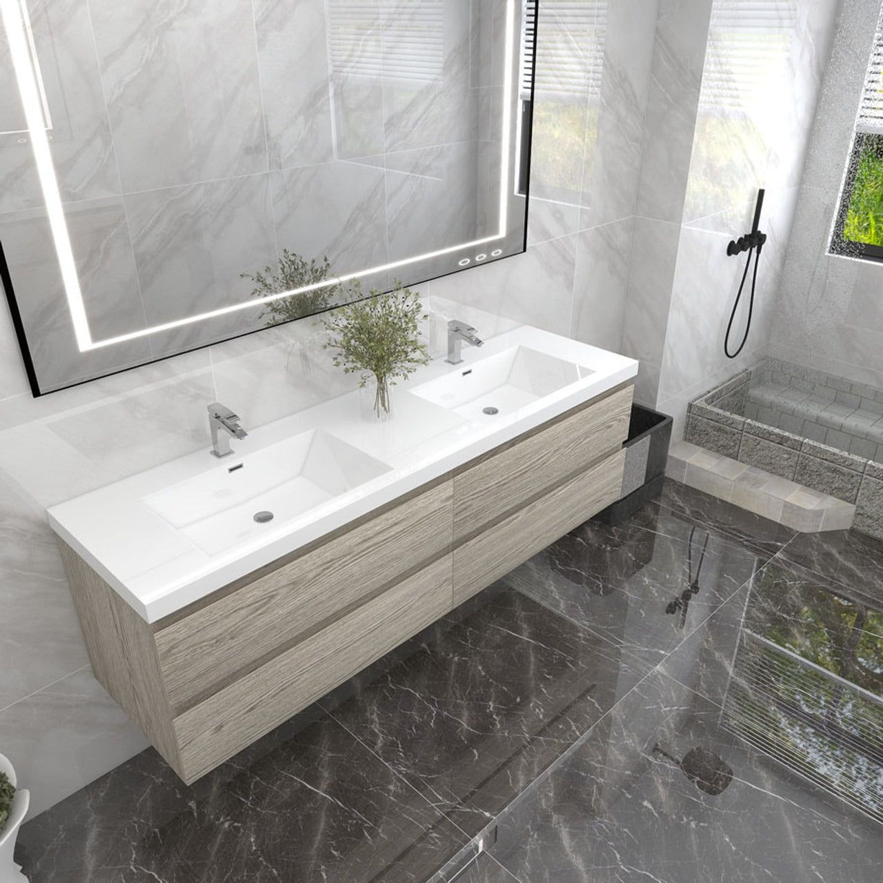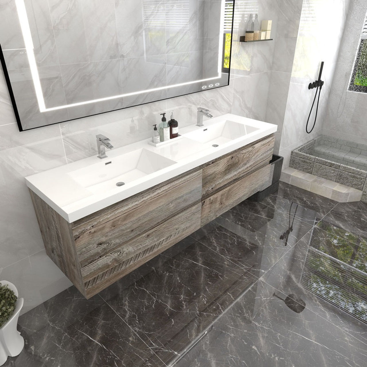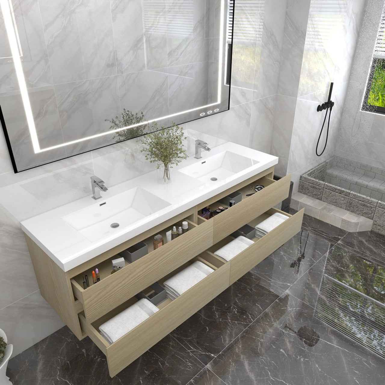 Crafted with engineered wood, it features a reinforced white acrylic top with a rectangular undermount sink and high-quality European DTC hardware that enhances the smoothness and reduces the noise of drawers. The modern wall-hung design brings a contemporary touch to the space. The overall palette is a harmonious blend of natural wood, stone textures, and sleek, modern lines, creating a serene and sophisticated atmosphere.