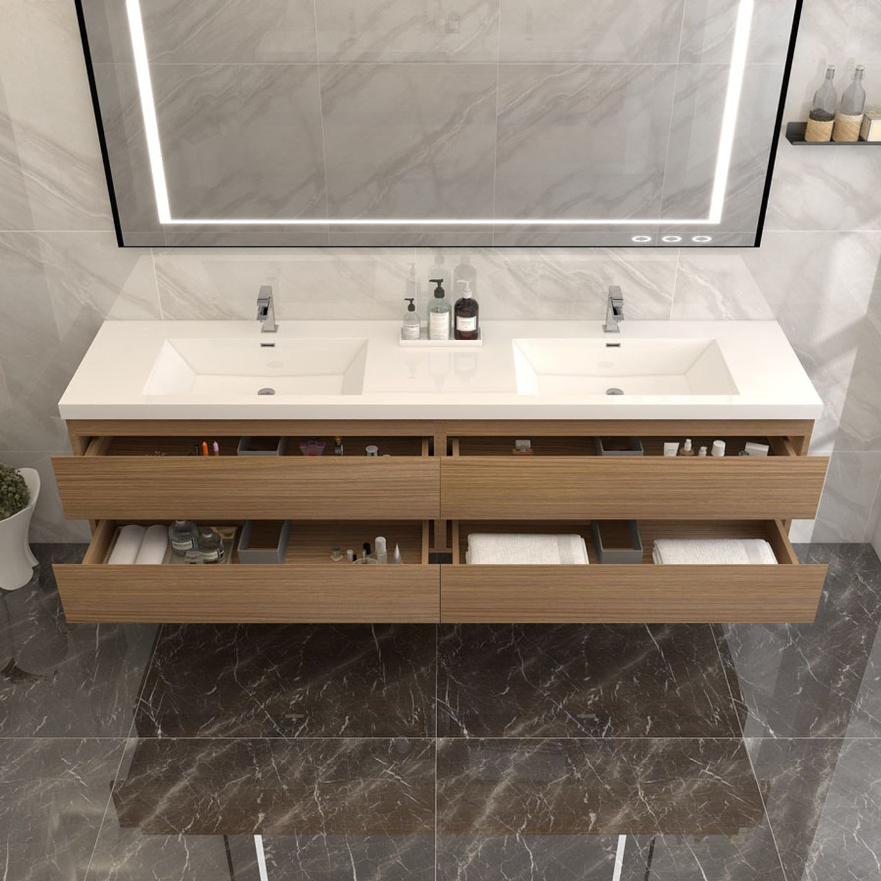 Crafted with engineered wood, it features a reinforced white acrylic top with a rectangular undermount sink and high-quality European DTC hardware that enhances the smoothness and reduces the noise of drawers. The modern wall-hung design brings a contemporary touch to the space. The overall palette is a harmonious blend of natural wood, stone textures, and sleek, modern lines, creating a serene and sophisticated atmosphere.