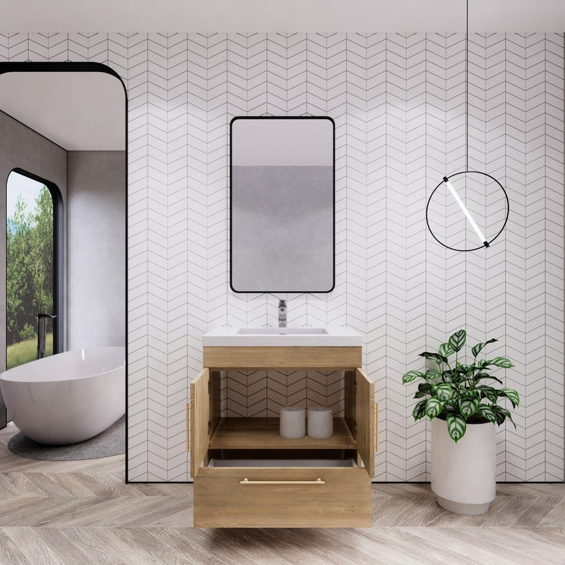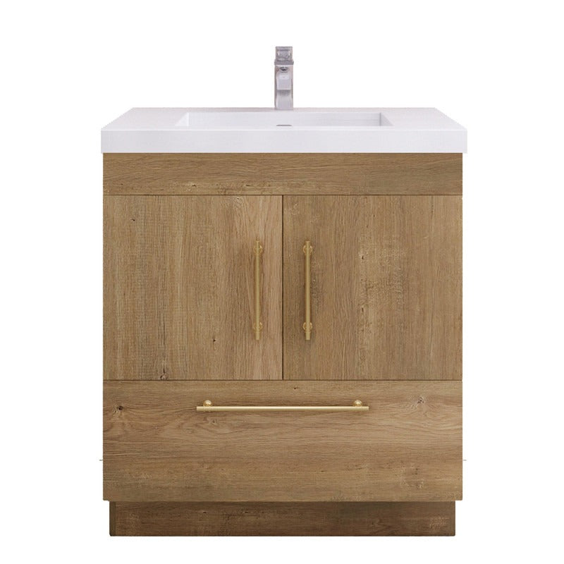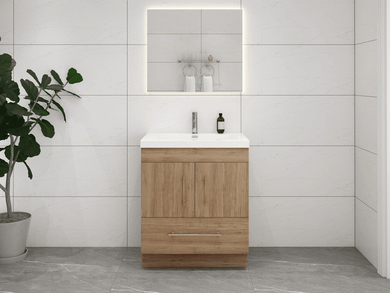 Upgrade your bathroom with this Aqua 30-inch freestanding bathroom vanity, designed with a clean square silhouette and a warm natural oak finish, this vanity is ideal for small bathrooms, powder rooms, and contemporary interiors.