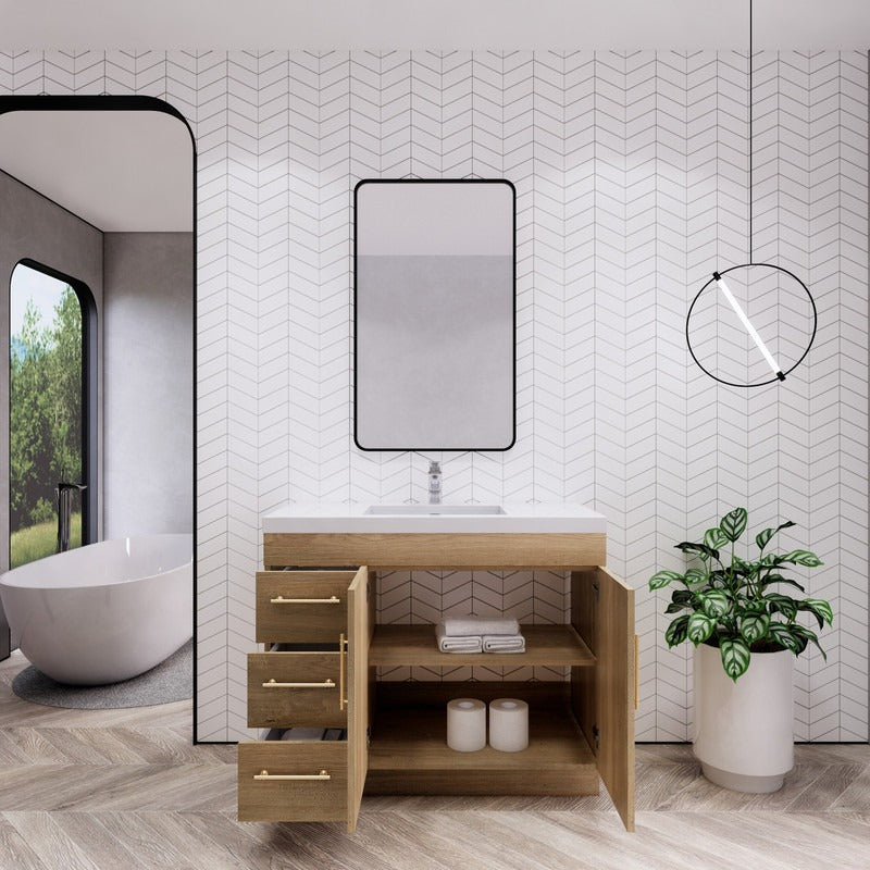 The floor-mounted design offers stability and classic functionality, while the compact footprint makes it perfect for space-conscious layouts. Featuring smooth wood grain detailing and minimalist hardware, this vanity blends modern style with everyday durability. The integrated white sink adds a crisp, refined contrast, creating a balanced and timeless look.