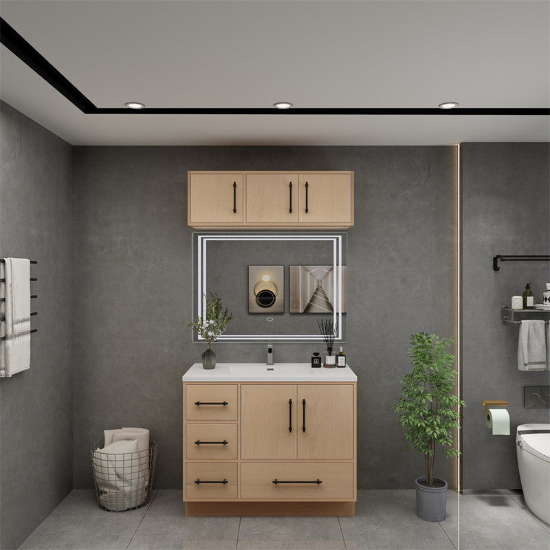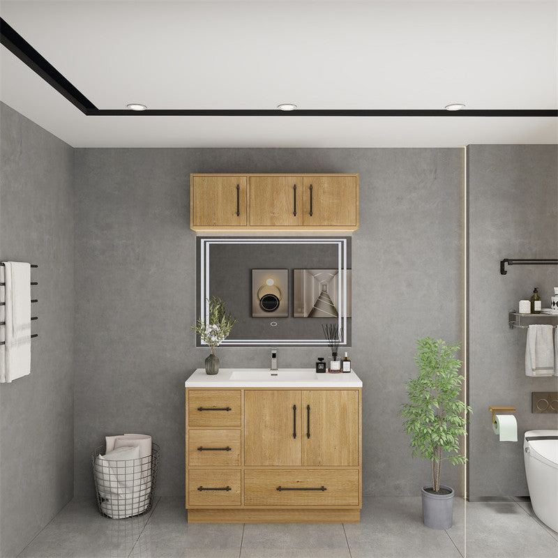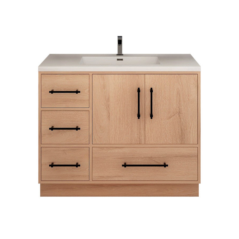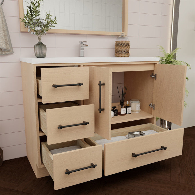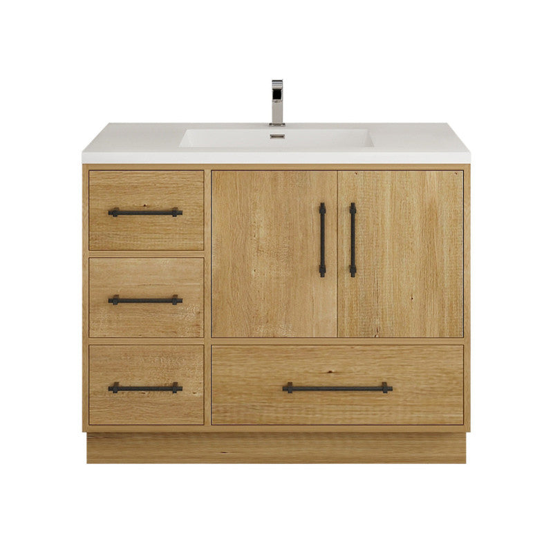 Upgrade your bathroom’s aesthetic and functionality with our 42-inch Arezzo freestanding bathroom vanity. The freestanding floor-mounted design offers stability and easy installation, while the single sink layout provides ample countertop space for everyday use. Multiple drawers and cabinet storage keep bathroom essentials neatly organized, and the contrasting black hardware adds a modern touch to the natural wood grain. Perfectly sized for mid-sized bathrooms, guest suites, or master remodels, this vanity combines a spacious countertop with smart storage solutions.