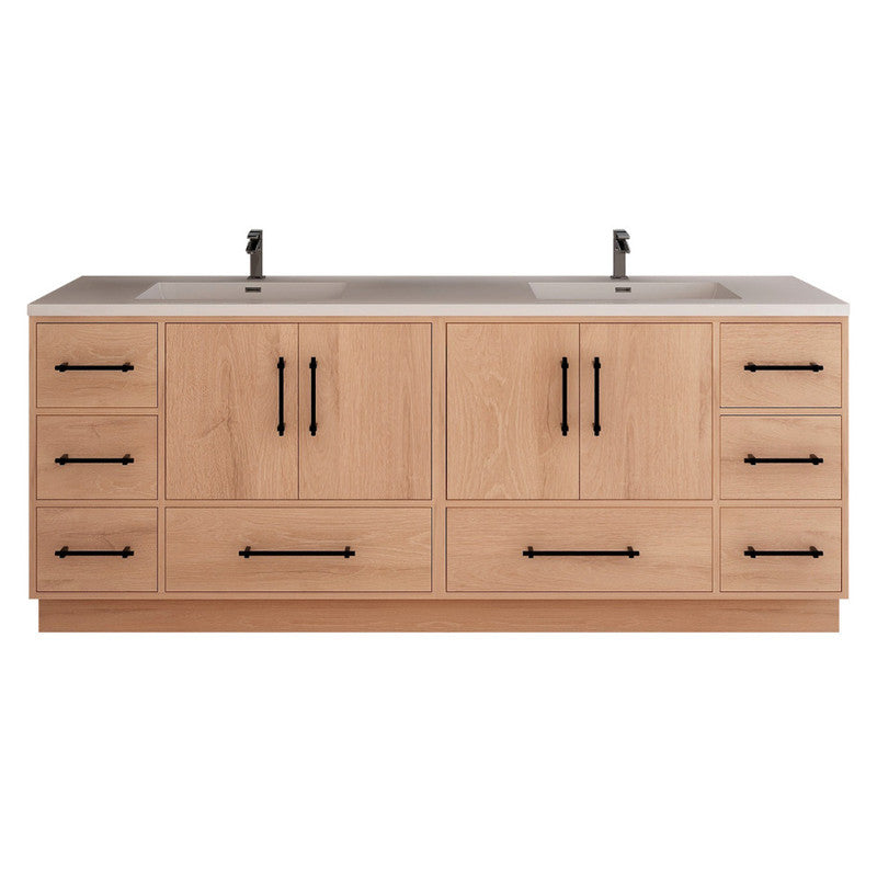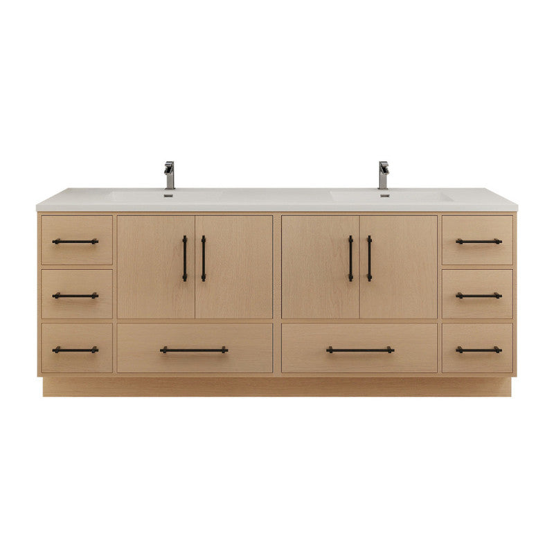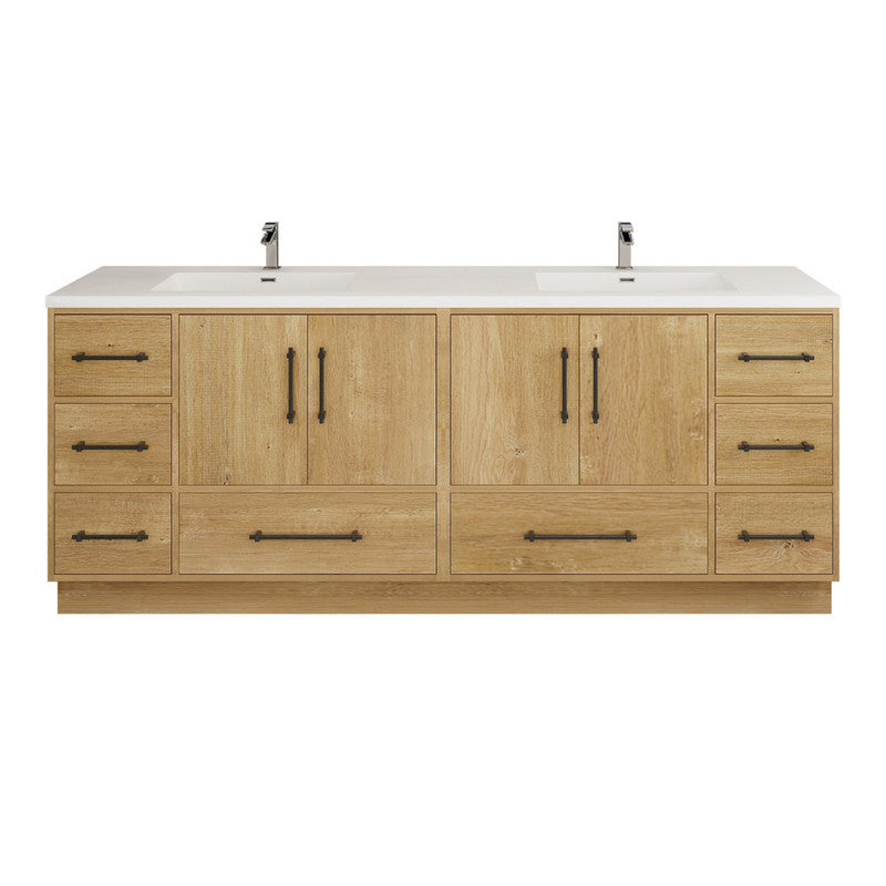 The 84" Arezzo freestanding floor-mounted design offers stability and a timeless look, while the double sink configuration provides added convenience for couples or families. Multiple drawers and cabinet compartments offer ample storage for bathroom essentials, keeping your space organized and clutter-free. Sleek black hardware adds a modern contrast to the natural wood grain, creating a refined, contemporary aesthetic. This vanity is an ideal choice for large-space master bathrooms, shared bathrooms, and contemporary interiors.