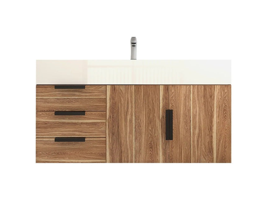 Elevate your bathroom with our Boreal Collection Bathroom Vanity. Crafted with attention to detail, the vanity's floating design allows for easy cleaning and lends an open feel to the space. This wall-mounted vanity showcases a minimalist design with clean lines and a natural wood finish. Its sturdy construction with a 5" thick countertop is accented by elegant and high-quality hardware, creating a luxurious yet statement look that complements any modern bathroom décor.