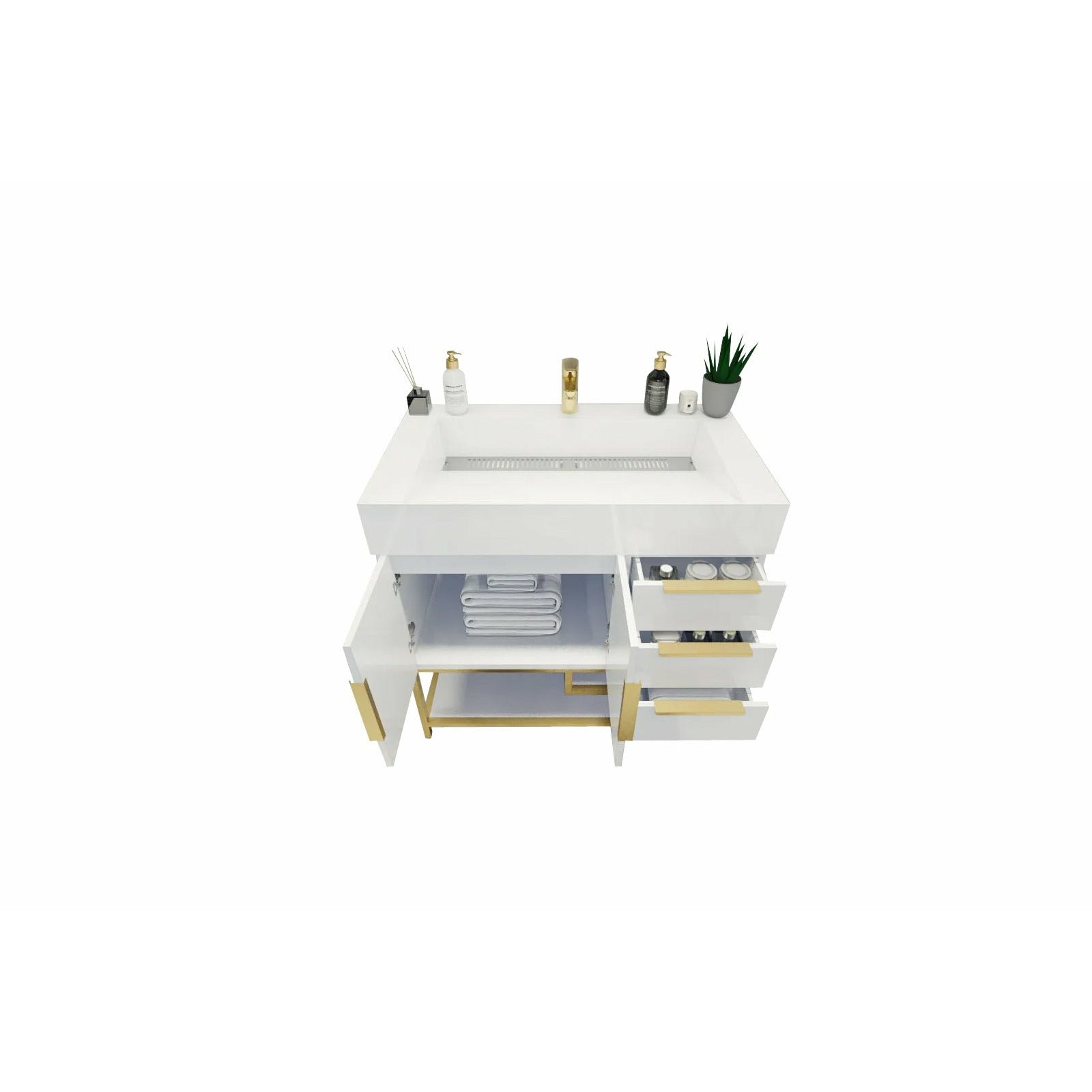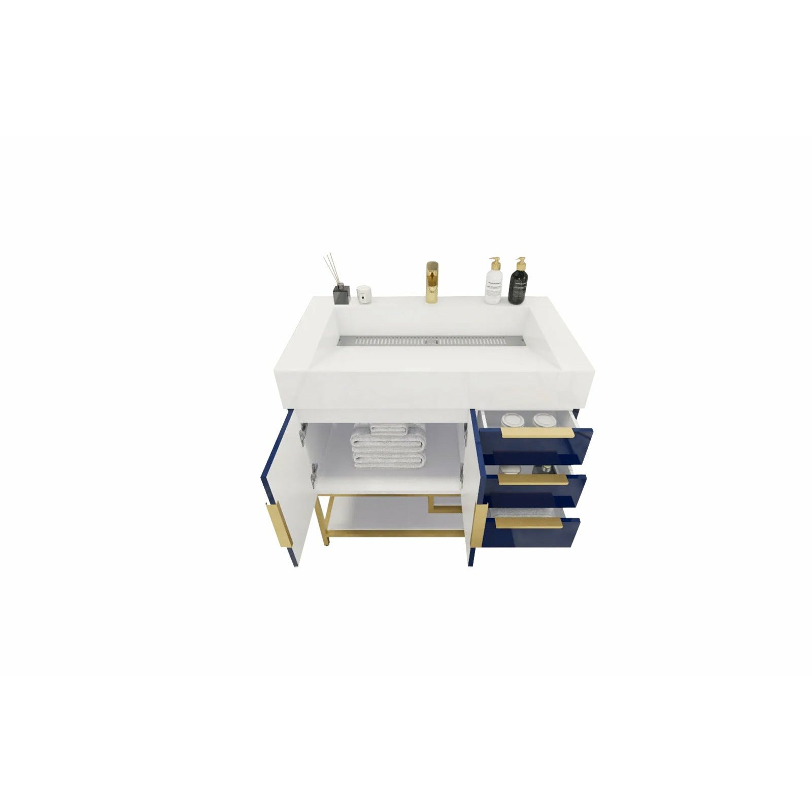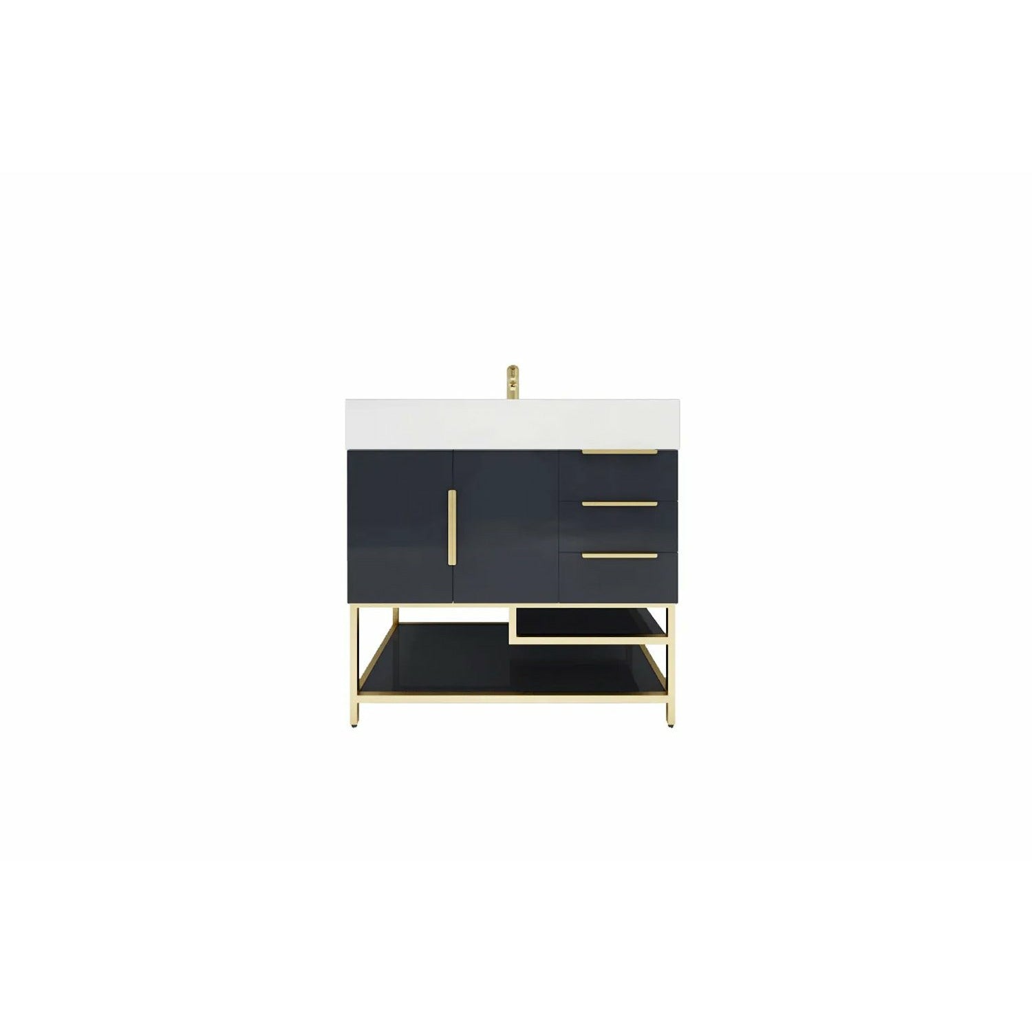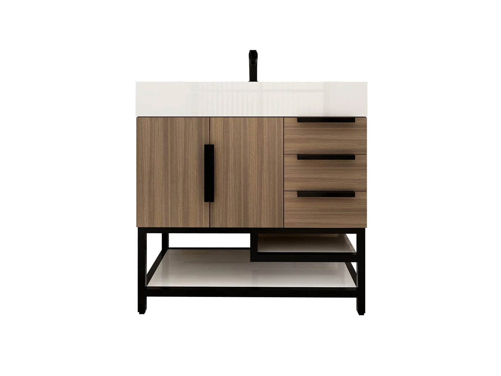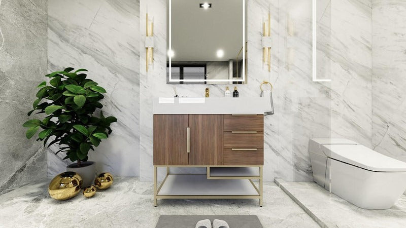 Introducing our Boreal Free-Standing vanity collection which is distinguished by its special aluminum alloy frame, providing both stability and a cool metallic accent that complements its elegant wood finish. The open shelf at the bottom provides additional space for towels and other bath items, making the vanity both practical and visually appealing. Now available with hardware options in black or classic metal to match your style preference, the Boreal free-standing vanity is perfect for adding a touch of luxury and functionality to your contemporary bathroom.