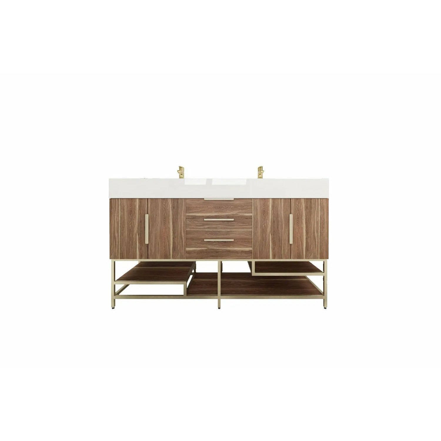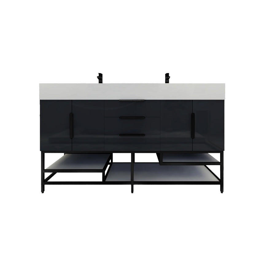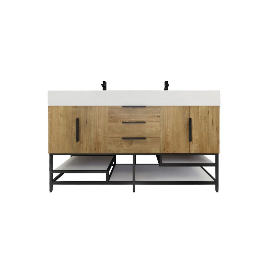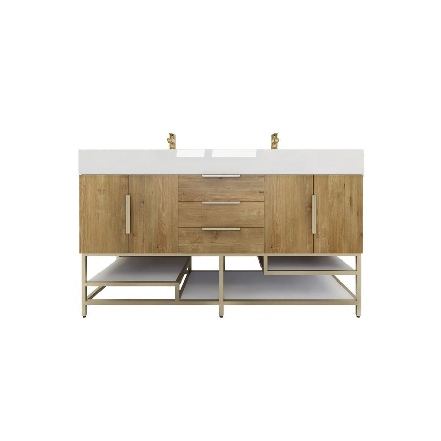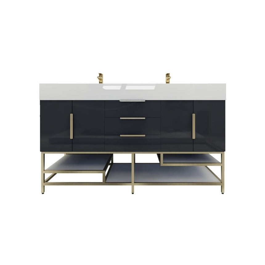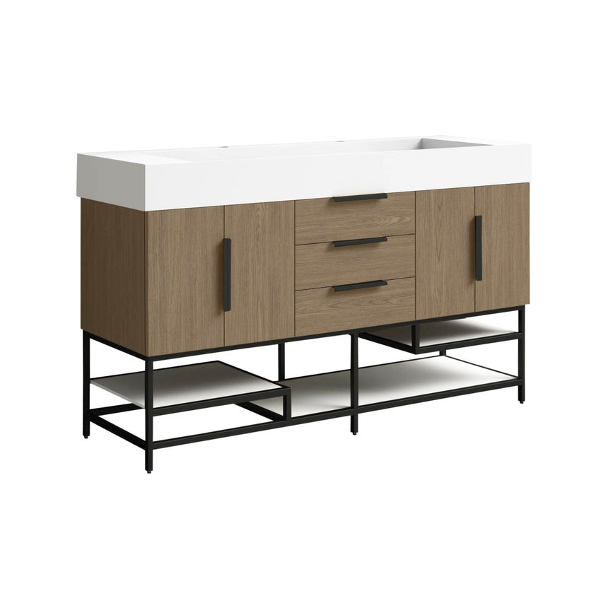 Introducing our Boreal Free-Standing vanity collection which is distinguished by its special aluminum alloy frame, providing both stability and a cool metallic accent that complements its elegant wood finish. The open shelf at the bottom provides additional space for towels and other bath items, making the vanity both practical and visually appealing. Now available with hardware options in black or classic metal to match your style preference, the Boreal free-standing vanity is perfect for adding a touch of luxury and functionality to your contemporary bathroom.