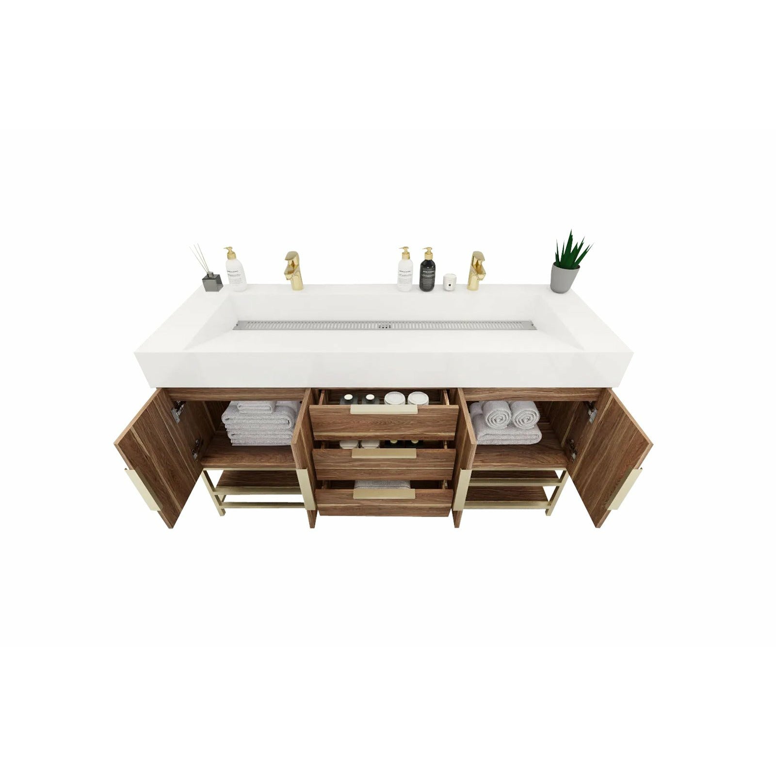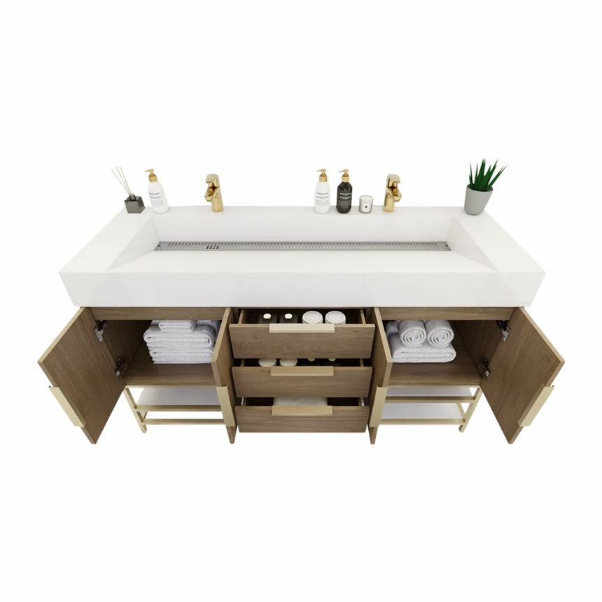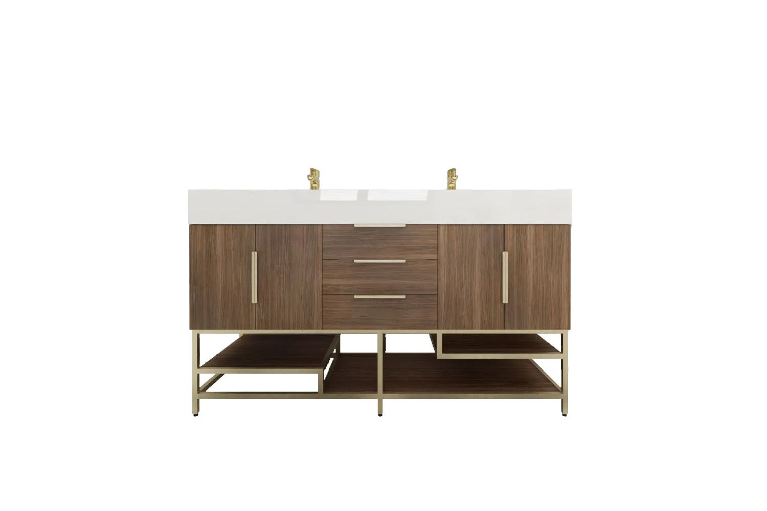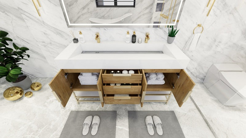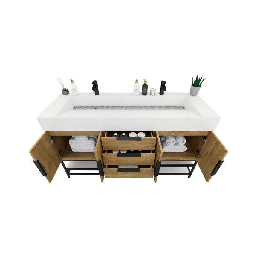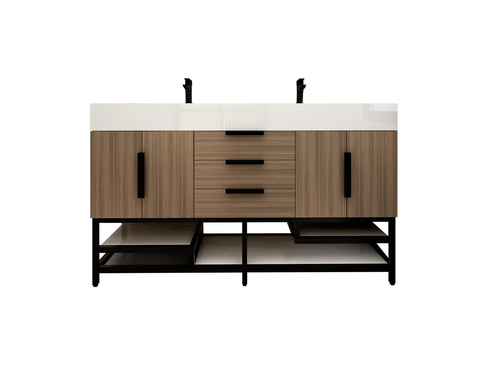 Introducing our Boreal Free-Standing vanity collection which is distinguished by its special aluminum alloy frame, providing both stability and a cool metallic accent that complements its elegant wood finish. The open shelf at the bottom provides additional space for towels and other bath items, making the vanity both practical and visually appealing. Now available with hardware options in black or classic metal to match your style preference, the Boreal free-standing vanity is perfect for adding a touch of luxury and functionality to your contemporary bathroom.