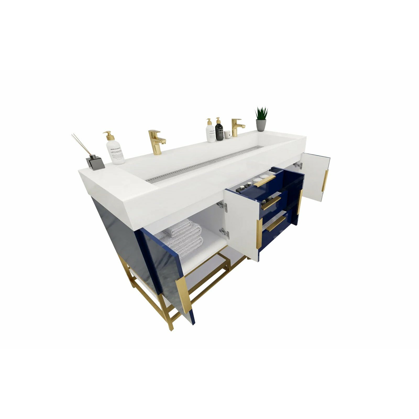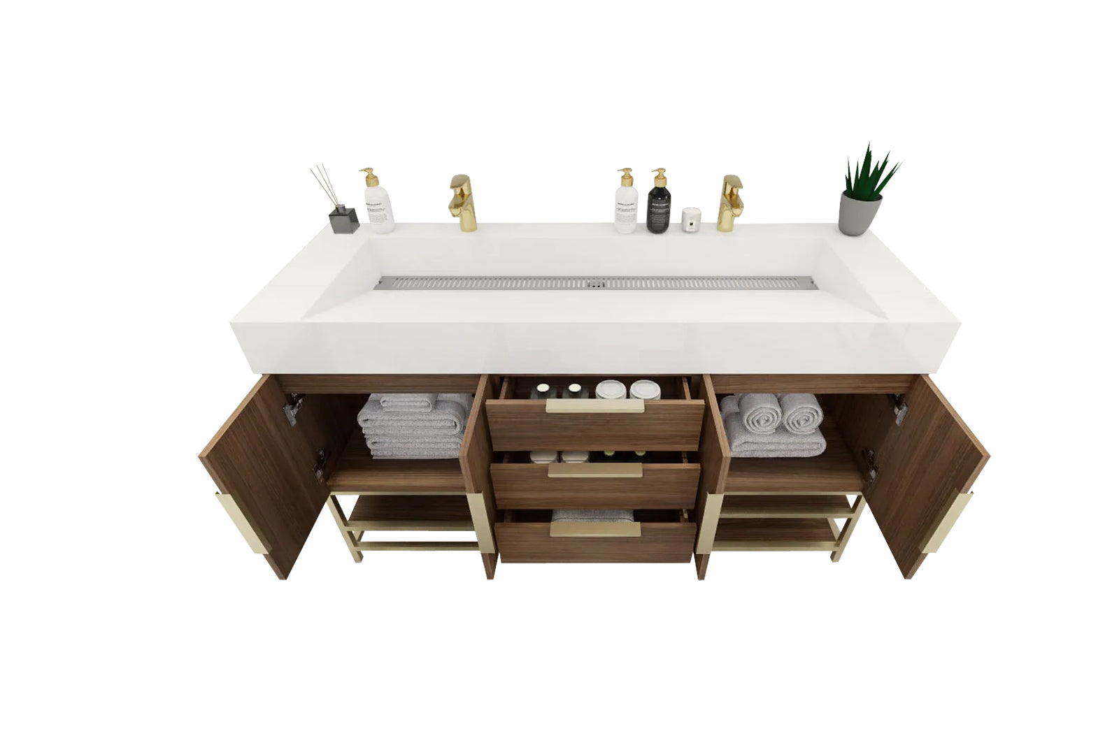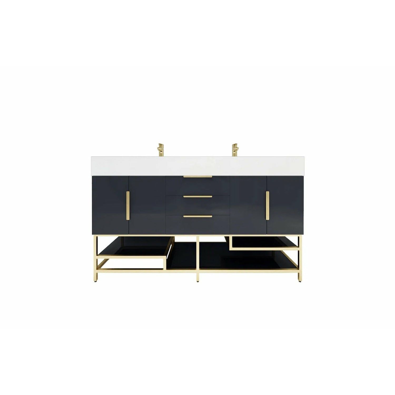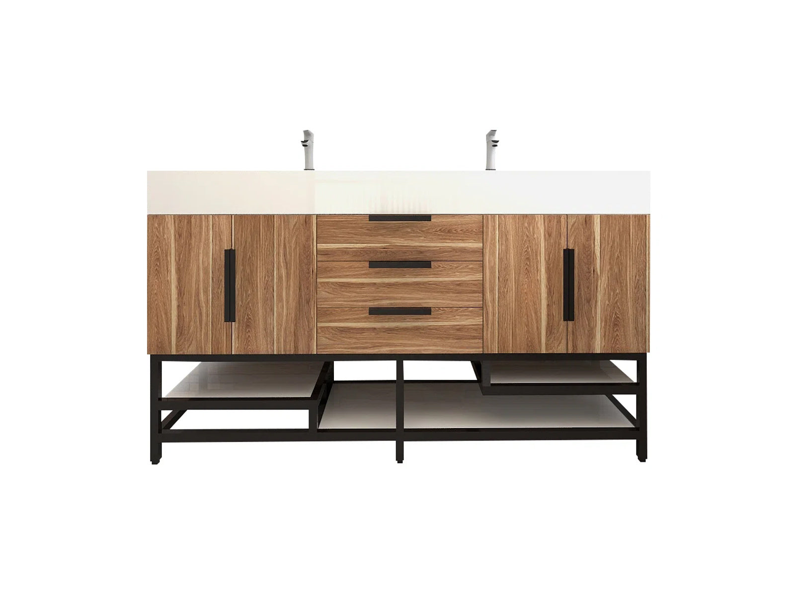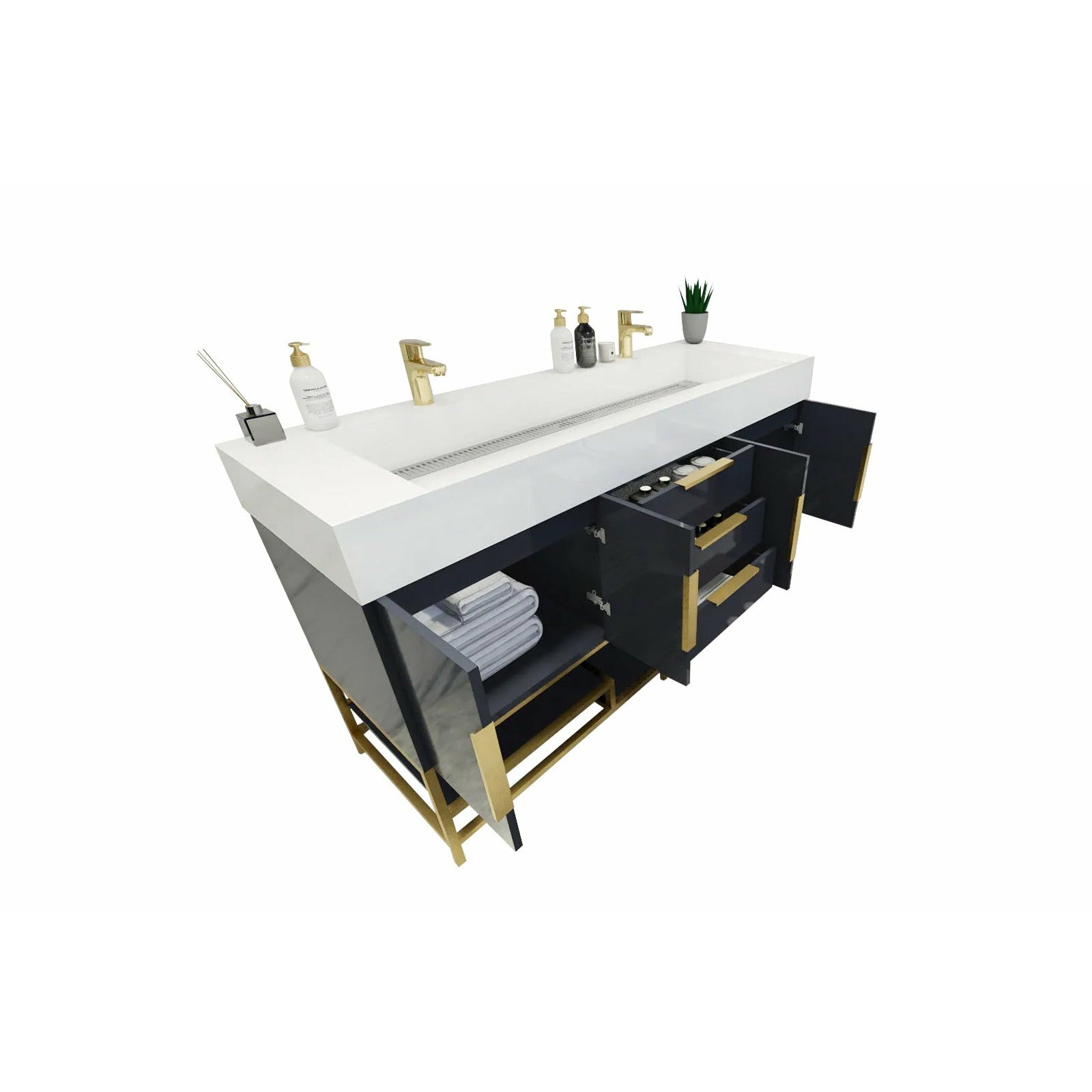 Introducing our Boreal Free-Standing vanity collection which is distinguished by its special aluminum alloy frame, providing both stability and a cool metallic accent that complements its elegant wood finish. The open shelf at the bottom provides additional space for towels and other bath items, making the vanity both practical and visually appealing. Now available with hardware options in black or classic metal to match your style preference, the Boreal free-standing vanity is perfect for adding a touch of luxury and functionality to your contemporary bathroom.