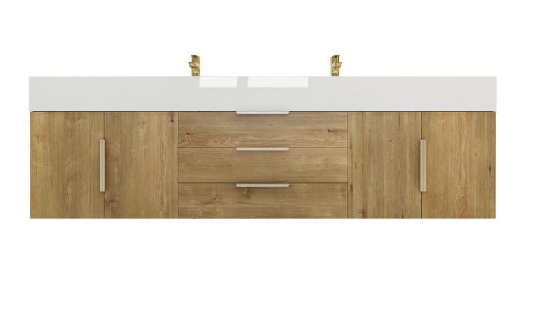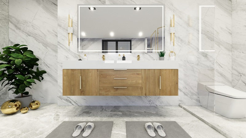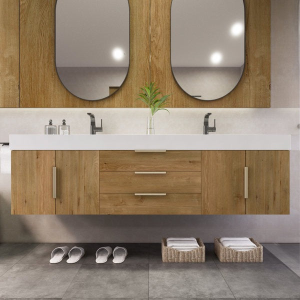 Elevate your bathroom with our Boreal Collection Bathroom Vanity. Crafted with attention to detail, the vanity's floating design allows for easy cleaning and lends an open feel to the space. This wall-mounted vanity showcases a minimalist design with clean lines and a natural wood finish. Its sturdy construction with a 5" thick countertop is accented by elegant and high-quality hardware, creating a luxurious yet statement look that complements any modern bathroom décor.