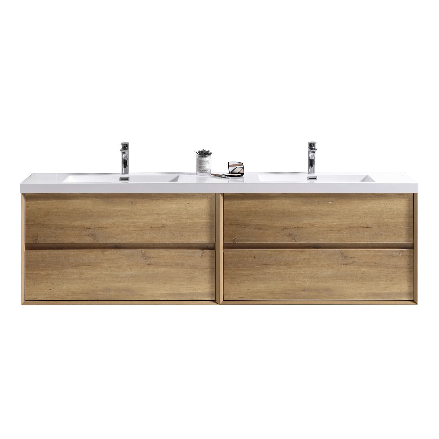 Combining functionality with a clean design, our Fiora Collection wall-mounted bathroom vanity will suit your minimalist style home perfectly. The vanity is made from high-quality MDF, which is better resilient to moisture damage and less impactful on the environment. Its neutral-color wood veneer finish and sleek appearance also bring a touch of nature to any modern decor.