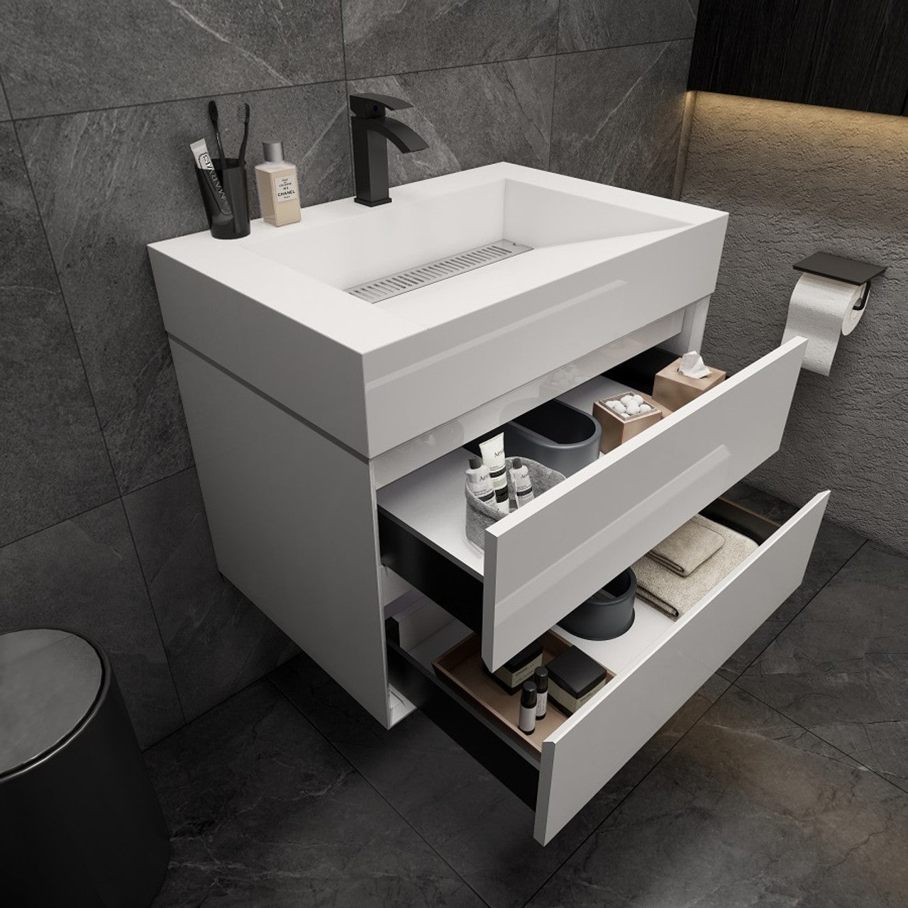 The Halo floating vanity collection features clean lines, the simple and handle-free design would be a great piece for your minimalist bathroom. Two large drawers provide ample storage for towels and other bathroom essentials, keeping your bathroom clutter-free and organized. The luxurious thick countertop with integrated acrylic sink is both aesthetically pleasing and highly durable. Each cabinet is finished inside and out, with a premium undercoat finish that is water-resistant and antibacterial. The modern floating design adds a contemporary touch to your bathroom, creating an illusion of more space and making cleaning easier.