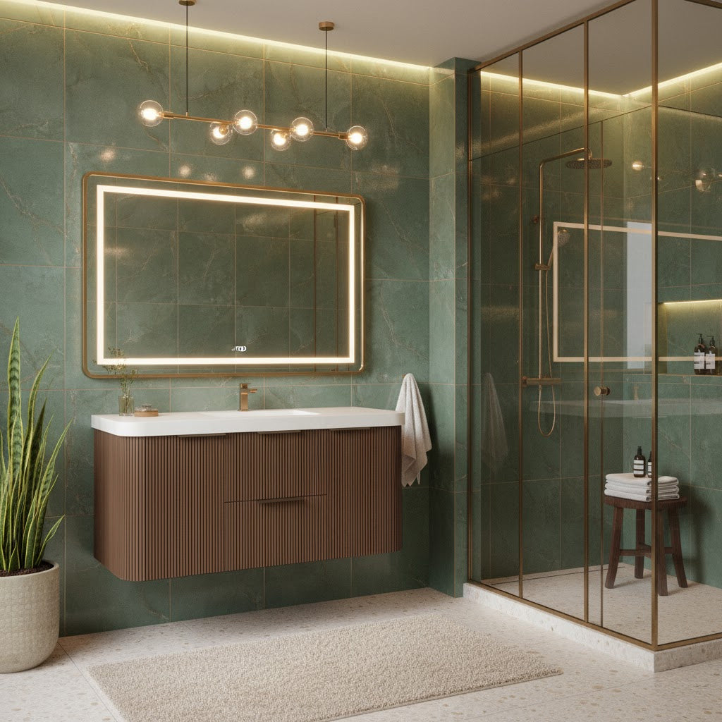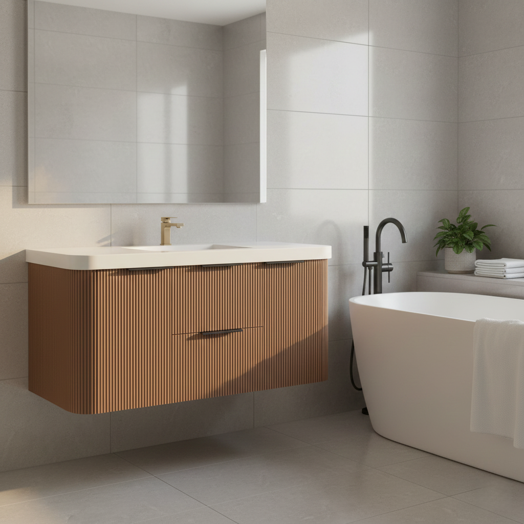 The Haven: Where Organic Modern Design Meets Function. Transform your bathroom into a serene sanctuary with the Haven Floating Vanity, dstinctly characterized by its fluted wood texture and soft curved edges, the Haven captures the essence of the trending Japandi and Organic Modern aesthetics. Its wall-mounted silhouette creates an airy, spacious feel, making it the perfect centerpiece for both compact powder rooms and expansive master suites.