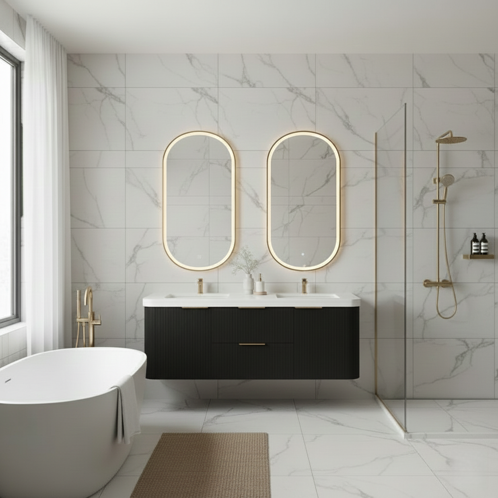 The Haven: Where Organic Modern Design Meets Function. Transform your bathroom into a serene sanctuary with the Haven Floating Vanity, dstinctly characterized by its fluted wood texture and soft curved edges, the Haven captures the essence of the trending Japandi and Organic Modern aesthetics. Its wall-mounted silhouette creates an airy, spacious feel, making it the perfect centerpiece for both compact powder rooms and expansive master suites.