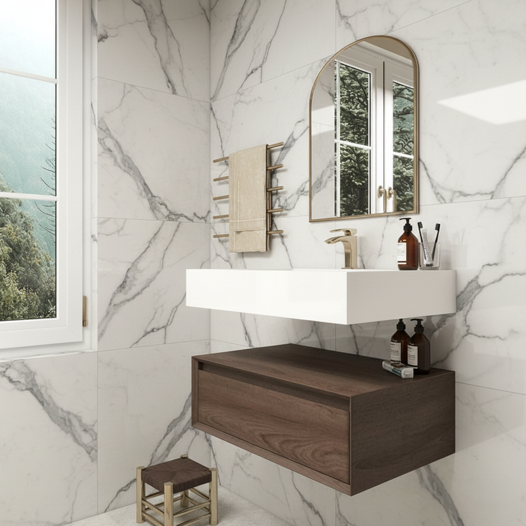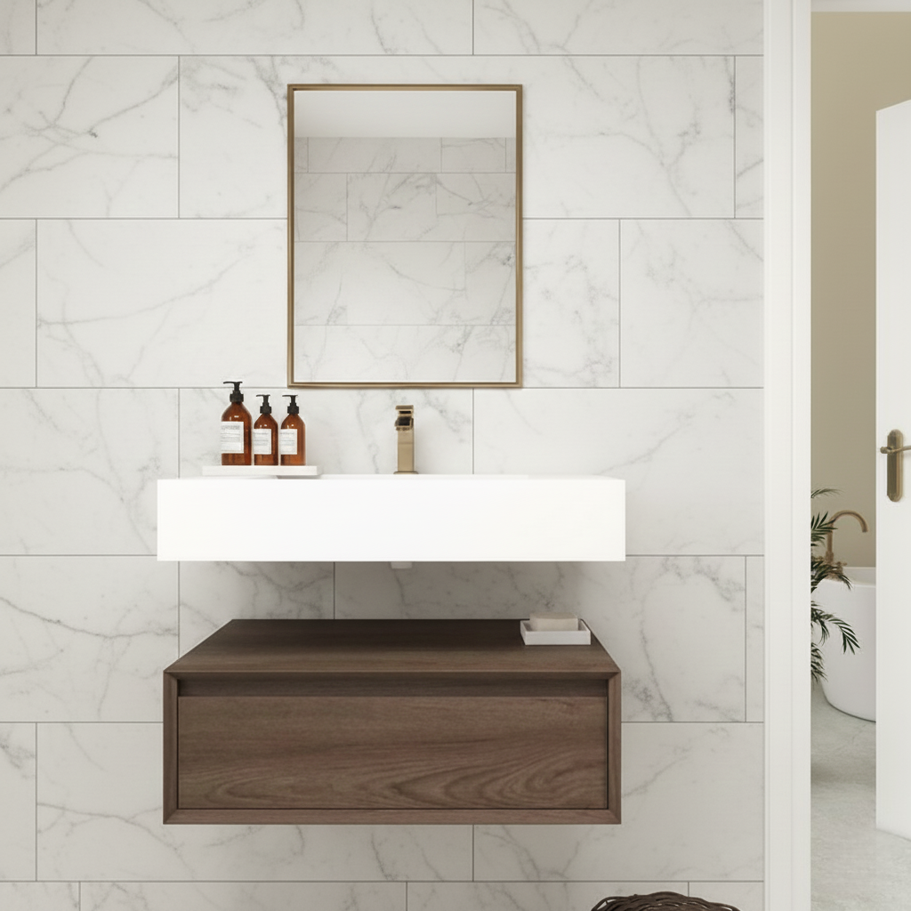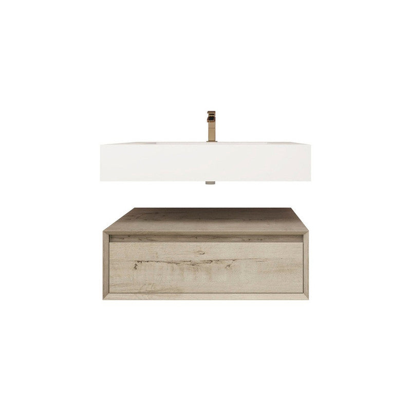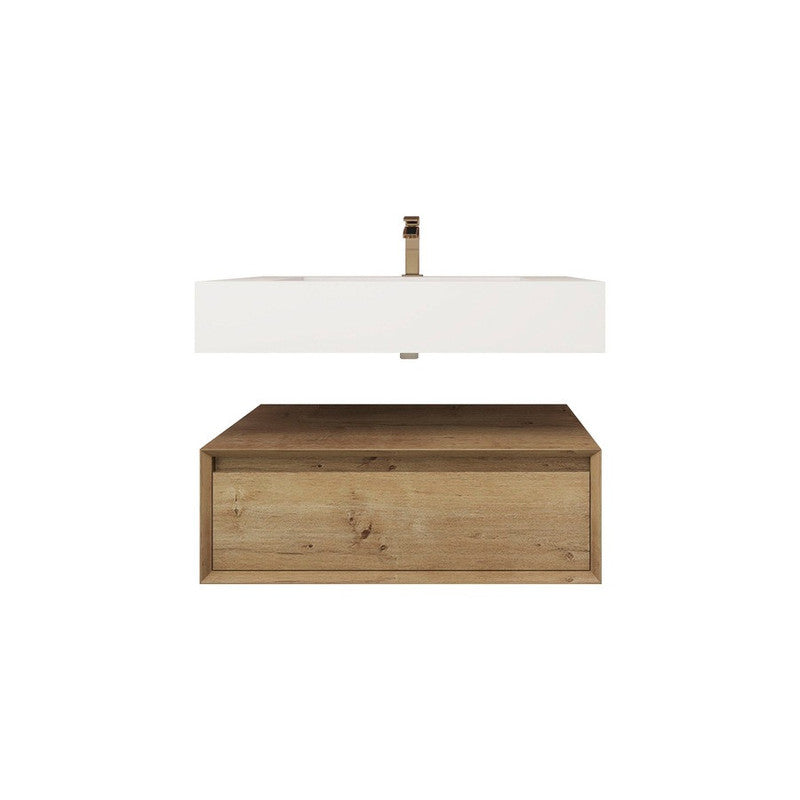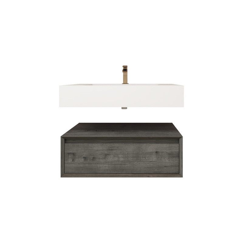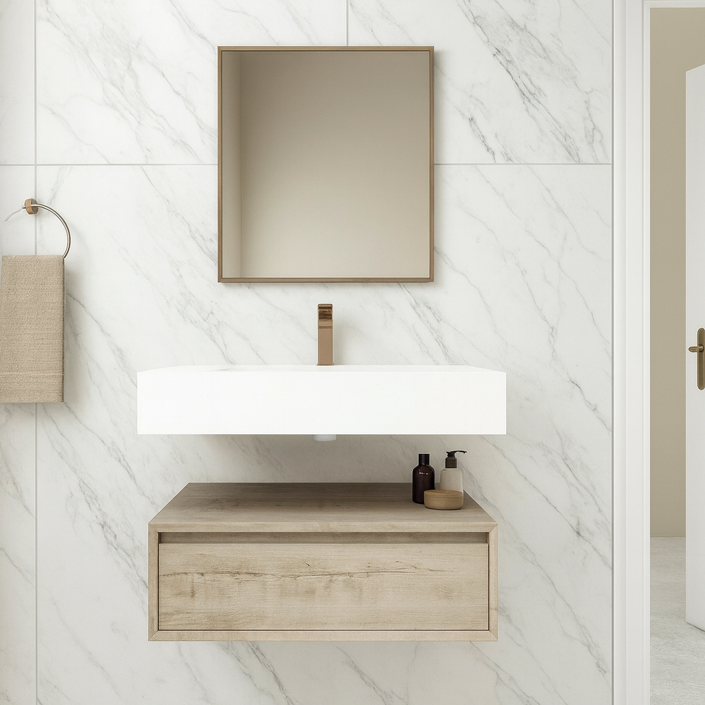 Elevate your space with our stunning 30-inch floating bathroom vanity set. Perfect for modern and contemporary bathrooms, this wall mount vanity creates a spacious, clean look while maximizing floor area. This premium set features a durable, moisture-resistant cabinet with a beautiful wood grain finish. The seamless integrated sink provides a sleek, easy-to-clean countertop, while the soft-close drawer offers ample, quiet storage for all your essentials.