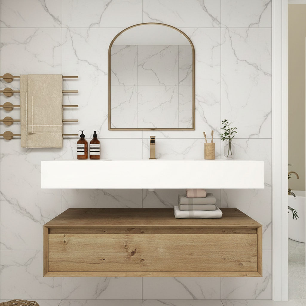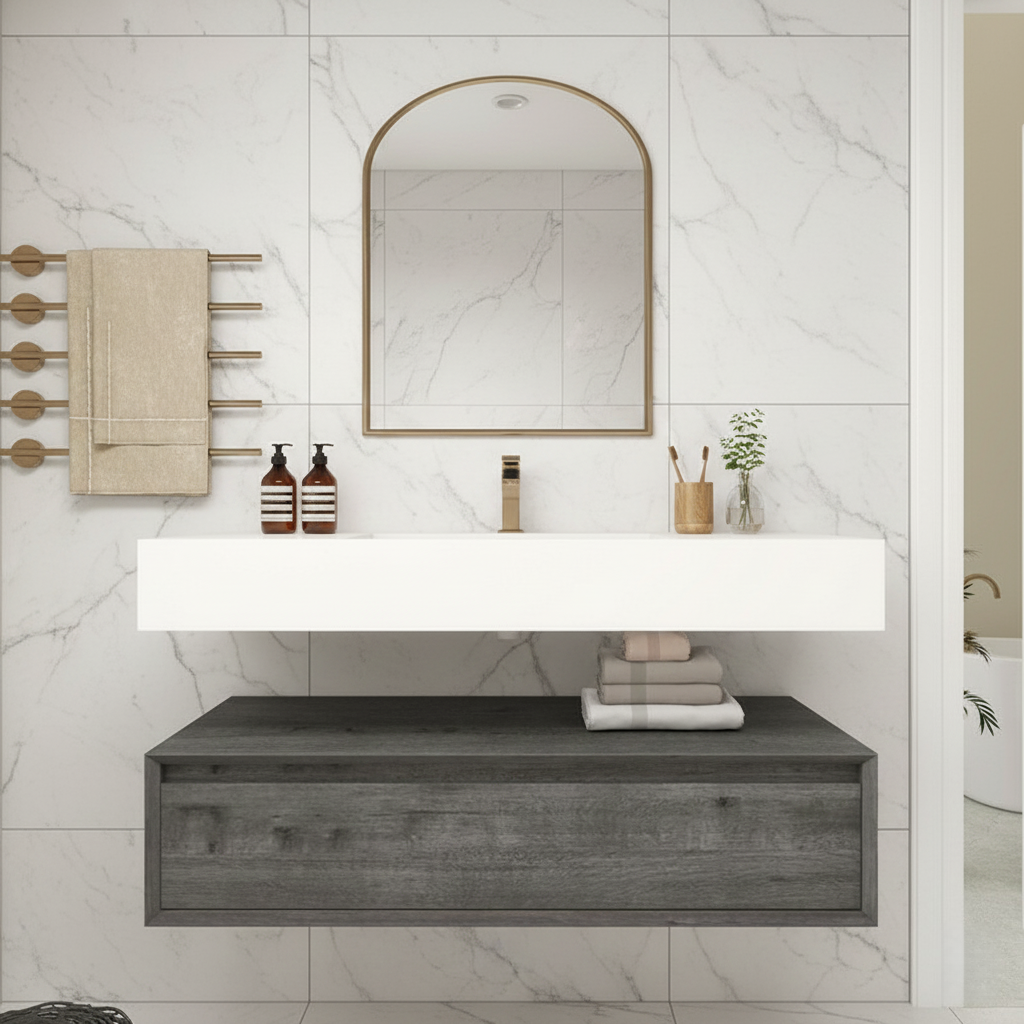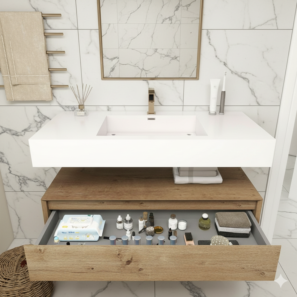 Transform your shared bathroom into a luxurious, organized retreat with this stunning 42-inch floating double sink vanity. Perfectly sized for master or Jack-and-Jill bathrooms, crafted with a durable cabinet finished in a sophisticated wood-grain tone, the vanity is paired with a smooth integrated sink that offers both style and easy maintenance. The 42" size provides generous countertop space and ample storage, making it an excellent choice for master bathrooms or shared spaces.