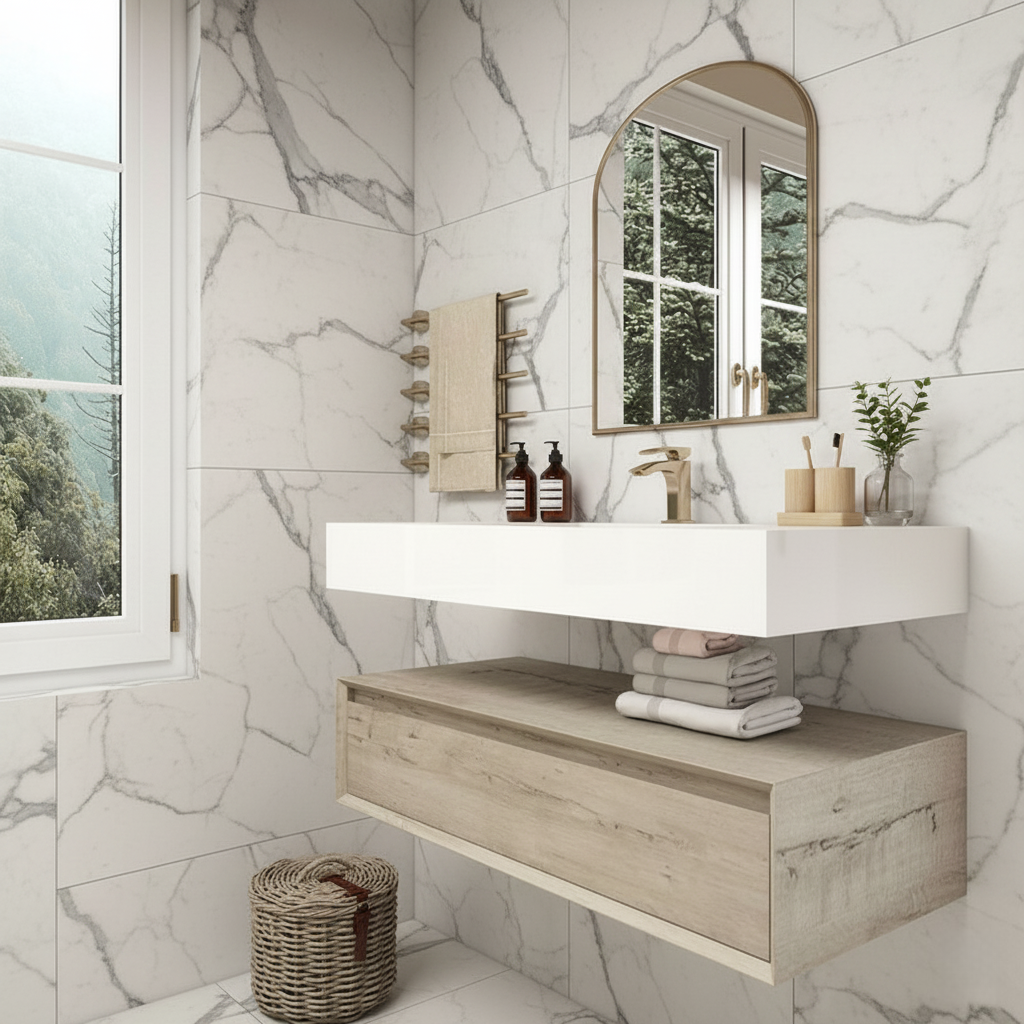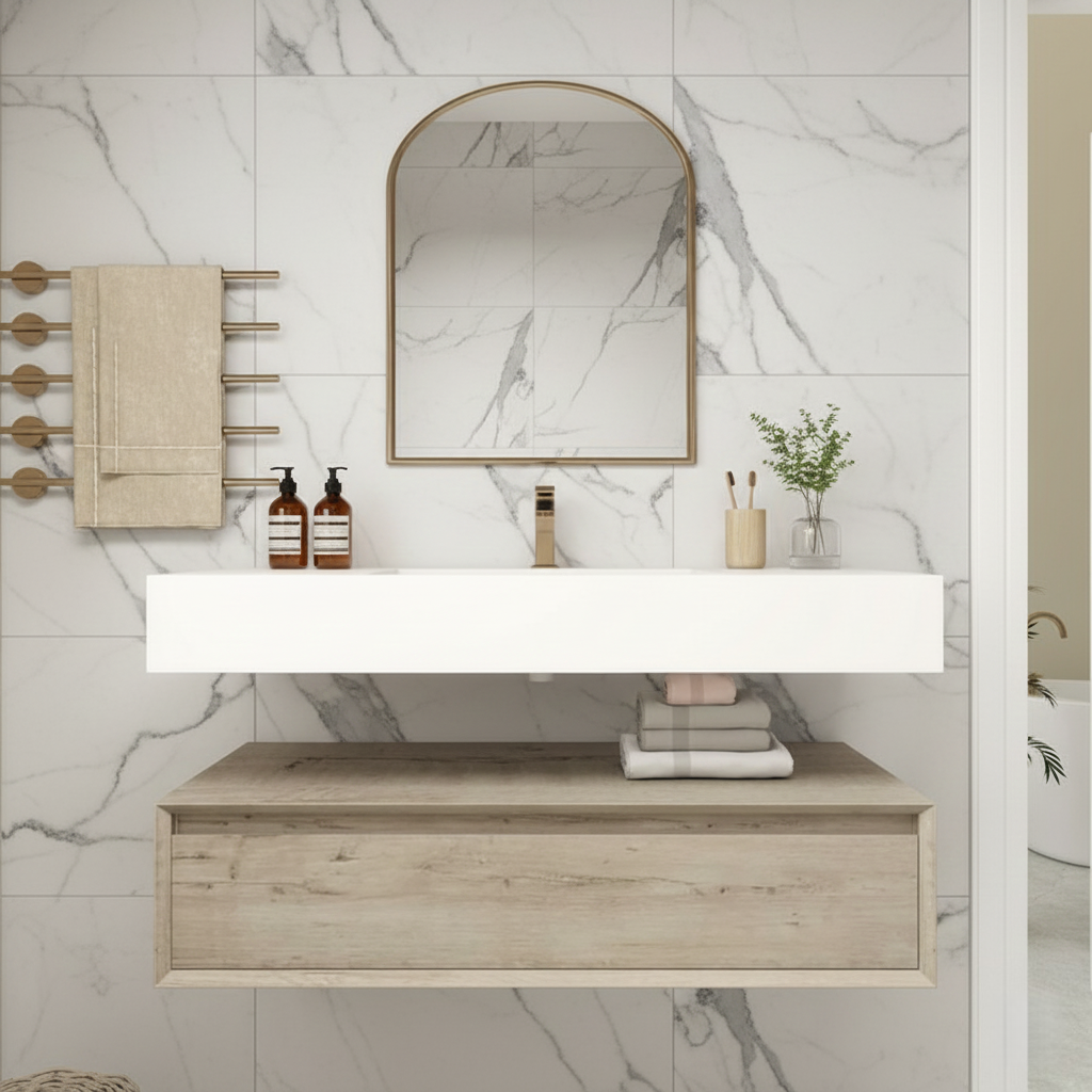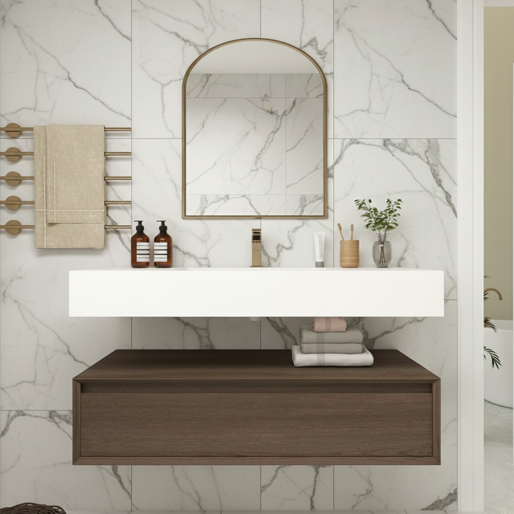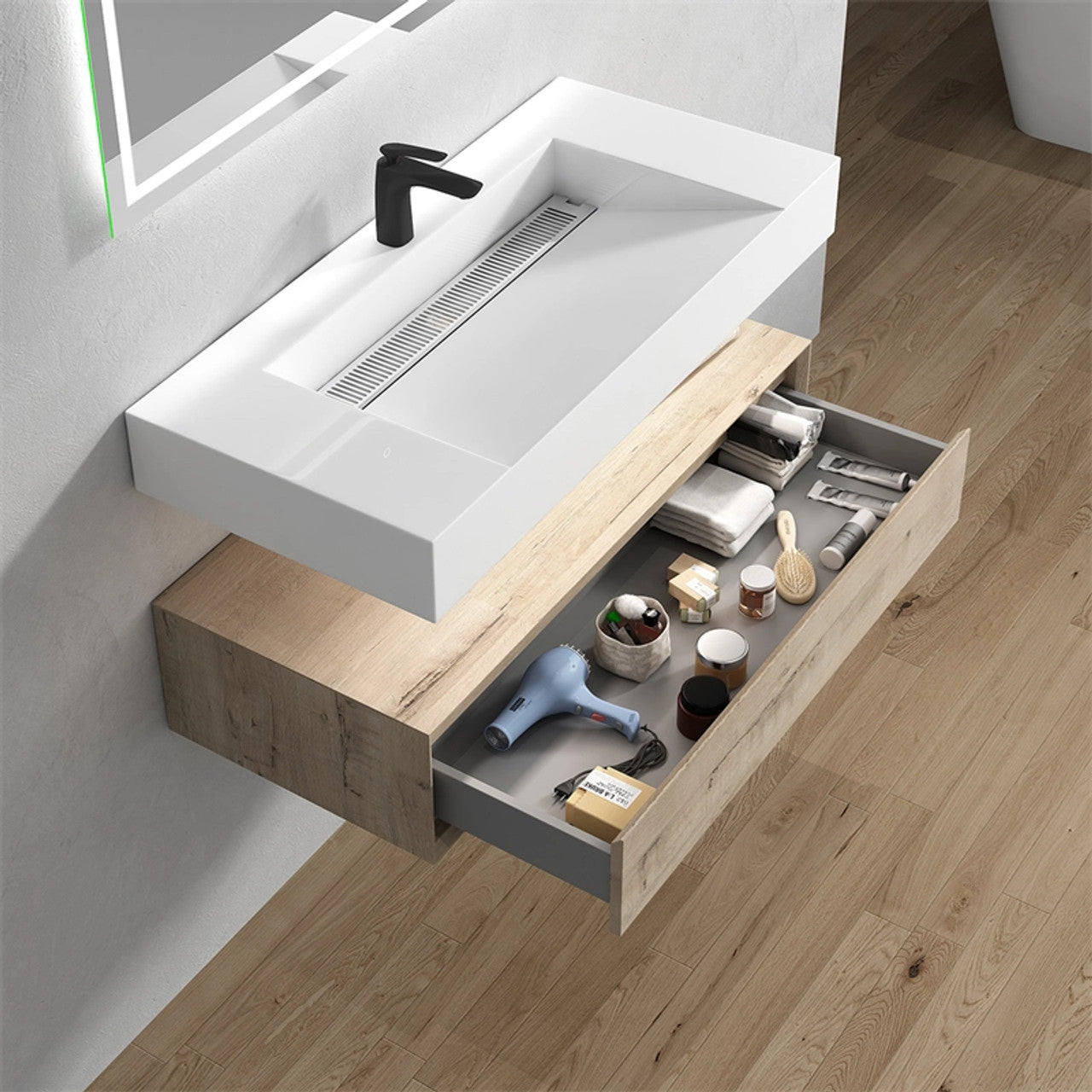 Transform your shared bathroom into a luxurious, organized retreat with this stunning 42-inch floating double sink vanity. Perfectly sized for master or Jack-and-Jill bathrooms, crafted with a durable cabinet finished in a sophisticated wood-grain tone, the vanity is paired with a smooth integrated sink that offers both style and easy maintenance. The 42" size provides generous countertop space and ample storage, making it an excellent choice for master bathrooms or shared spaces.